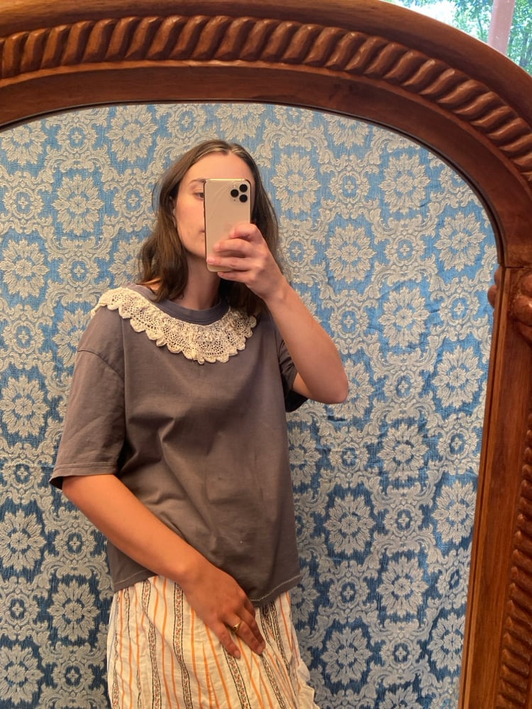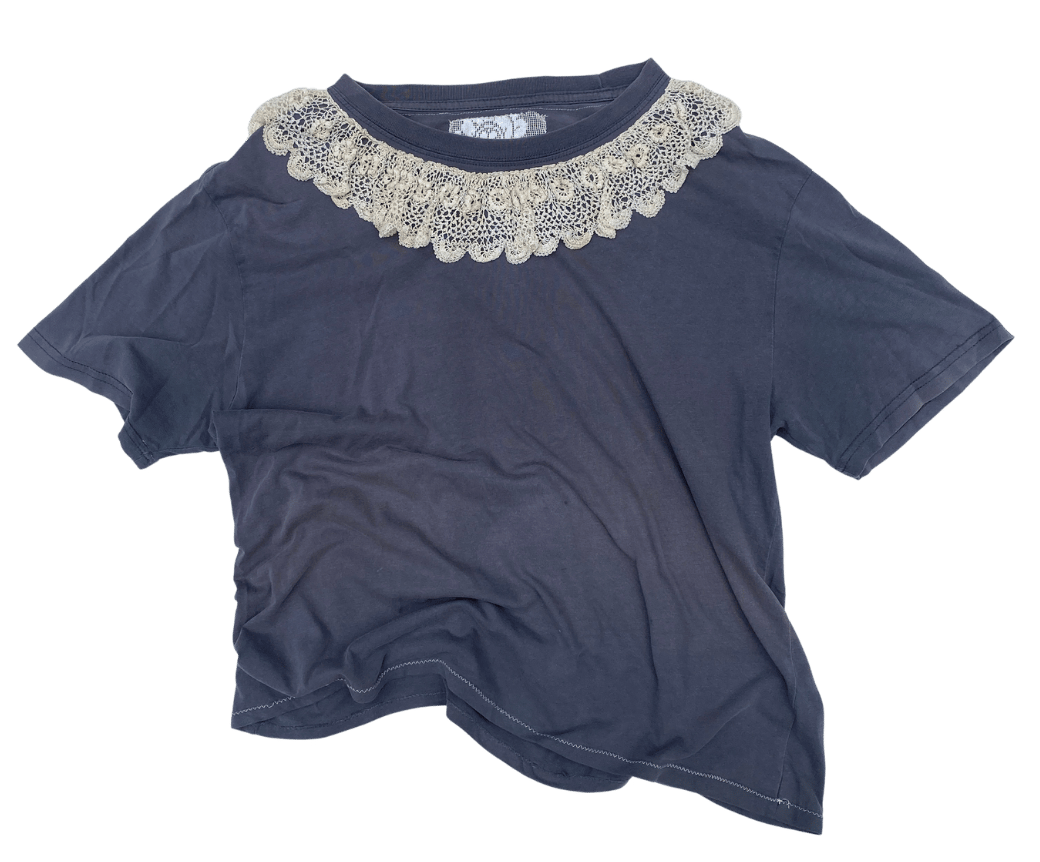 upcycled short sleeve charcoal grey cotton tee with antique cotton lace collar.