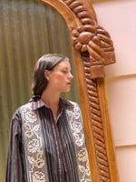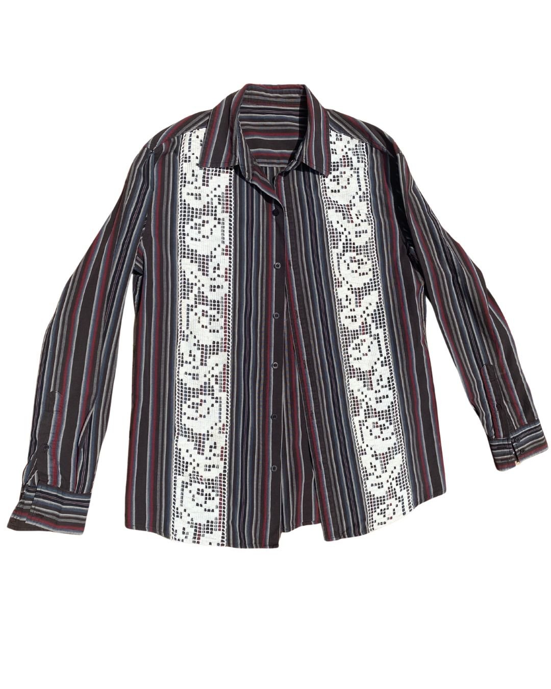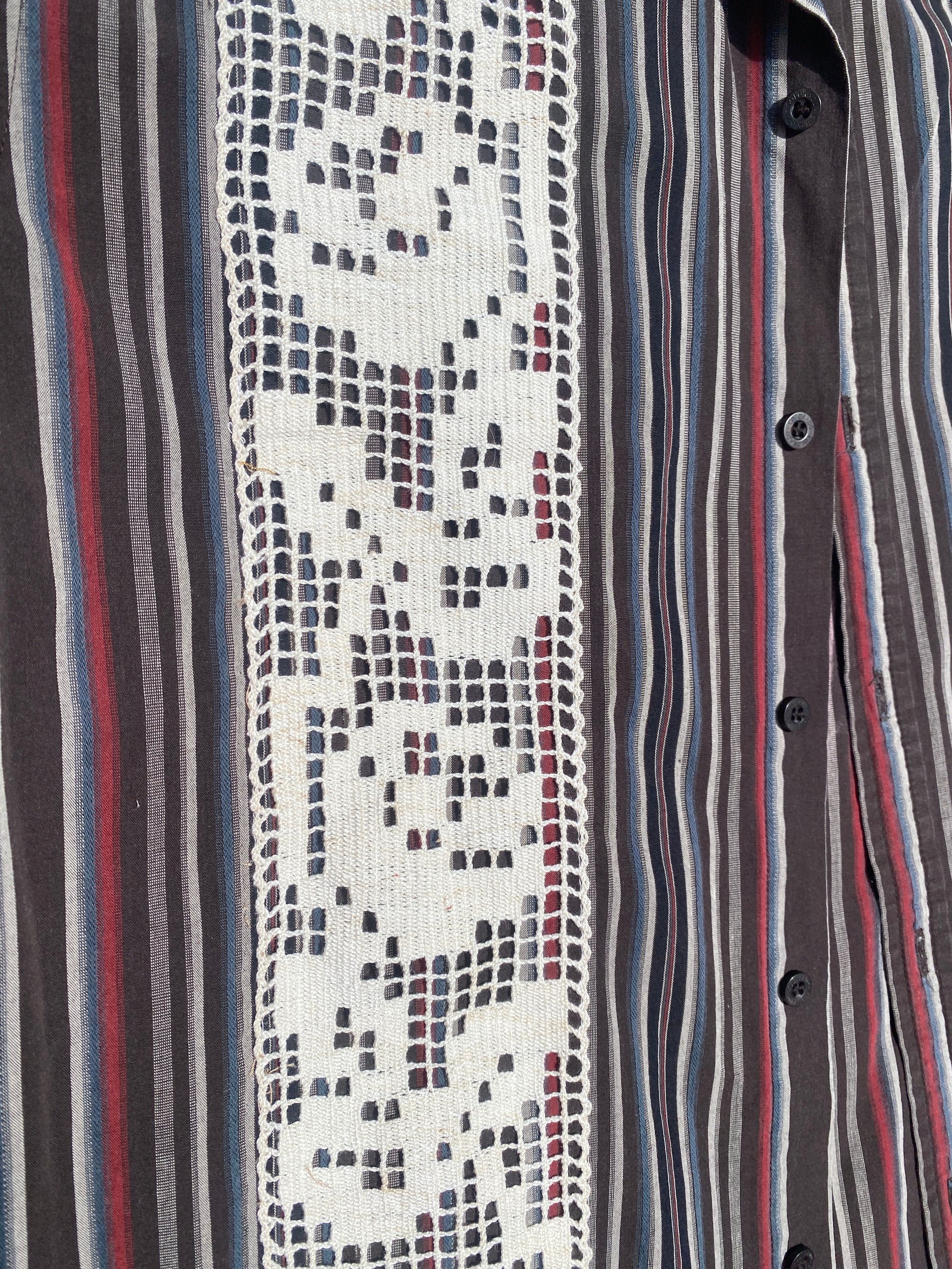 button up black, brown, red and cream vintage long sleeved shirt with antique french filet netting lace applique.