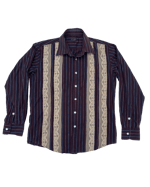 button up black, red and grey stripe upcycled long sleeved shirt with antique cotton lace applique.