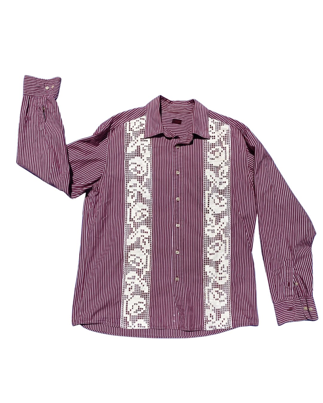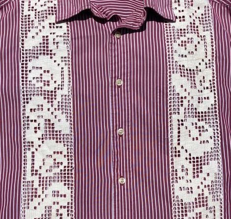 button up red and white striped vintage long sleeved shirt with antique french filet netting lace applique.