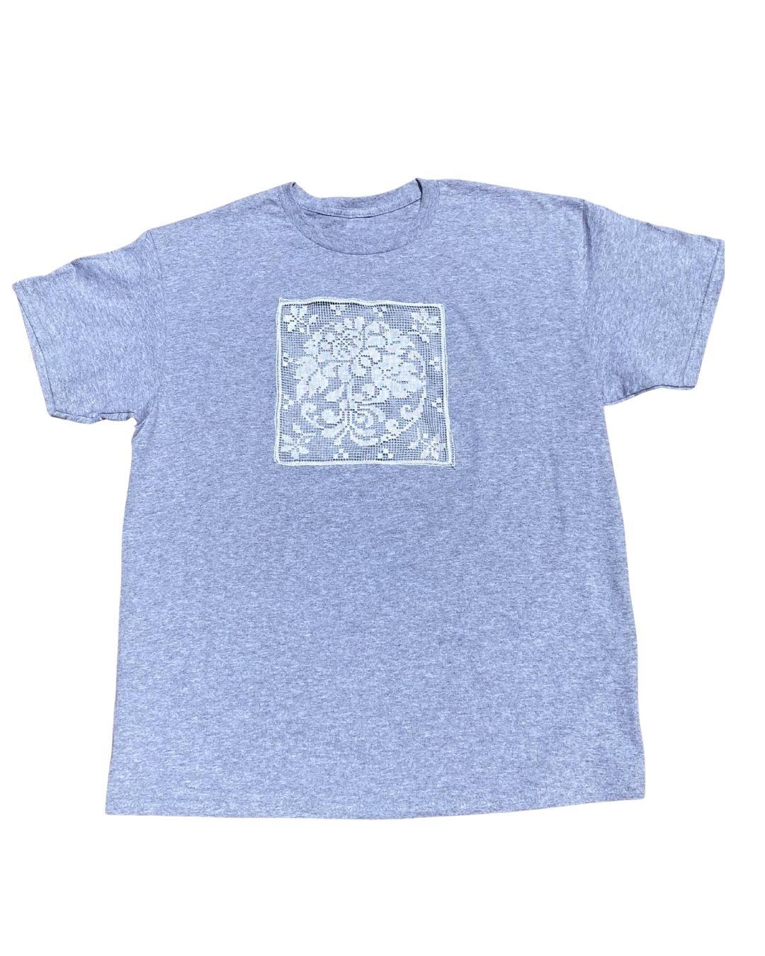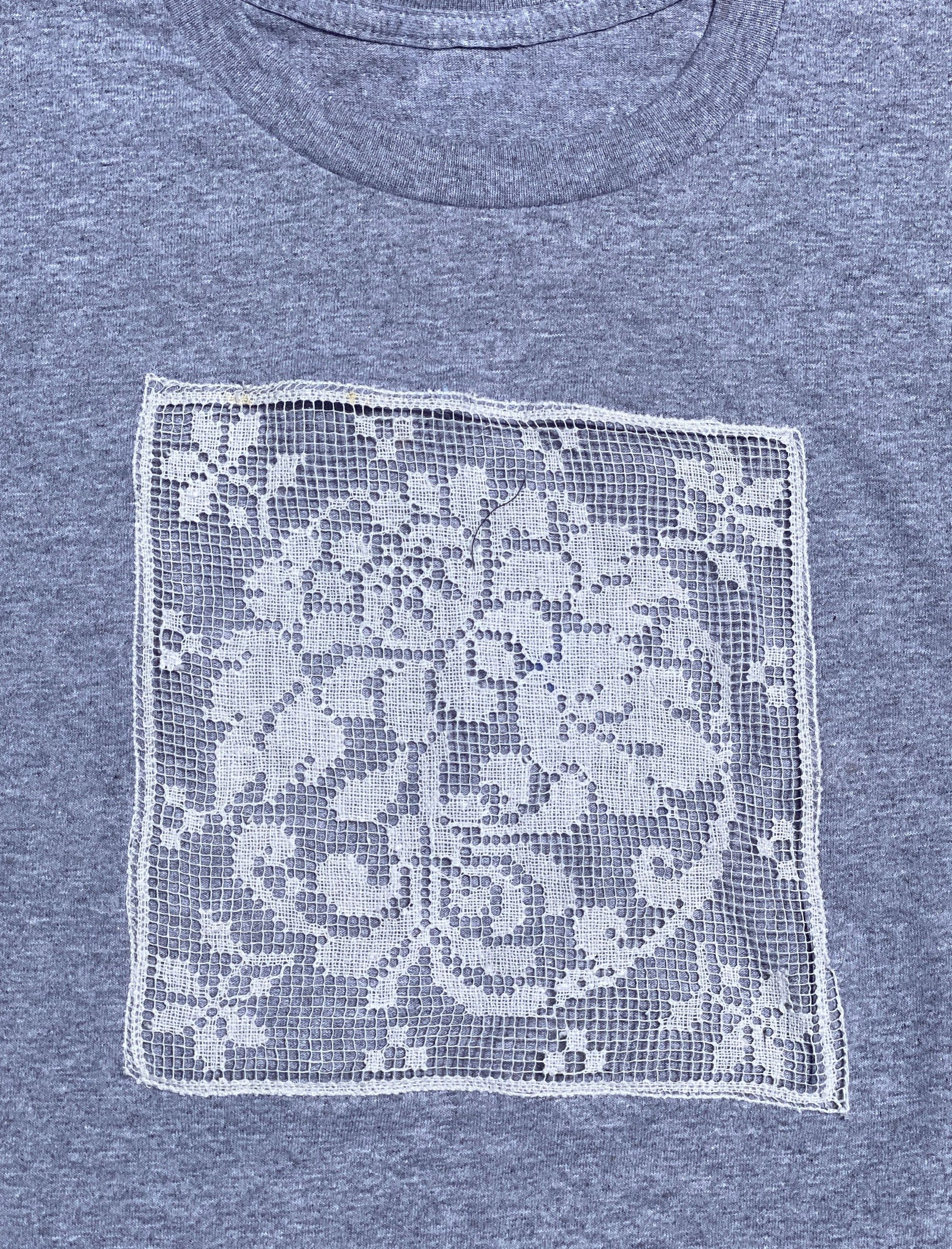 grey t shirt with vintage square cream cotton filet window.