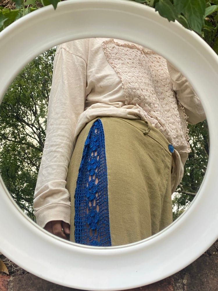 Upcycled linen twill/elastane trousers with antique cobalt blue rayon lace inserts.